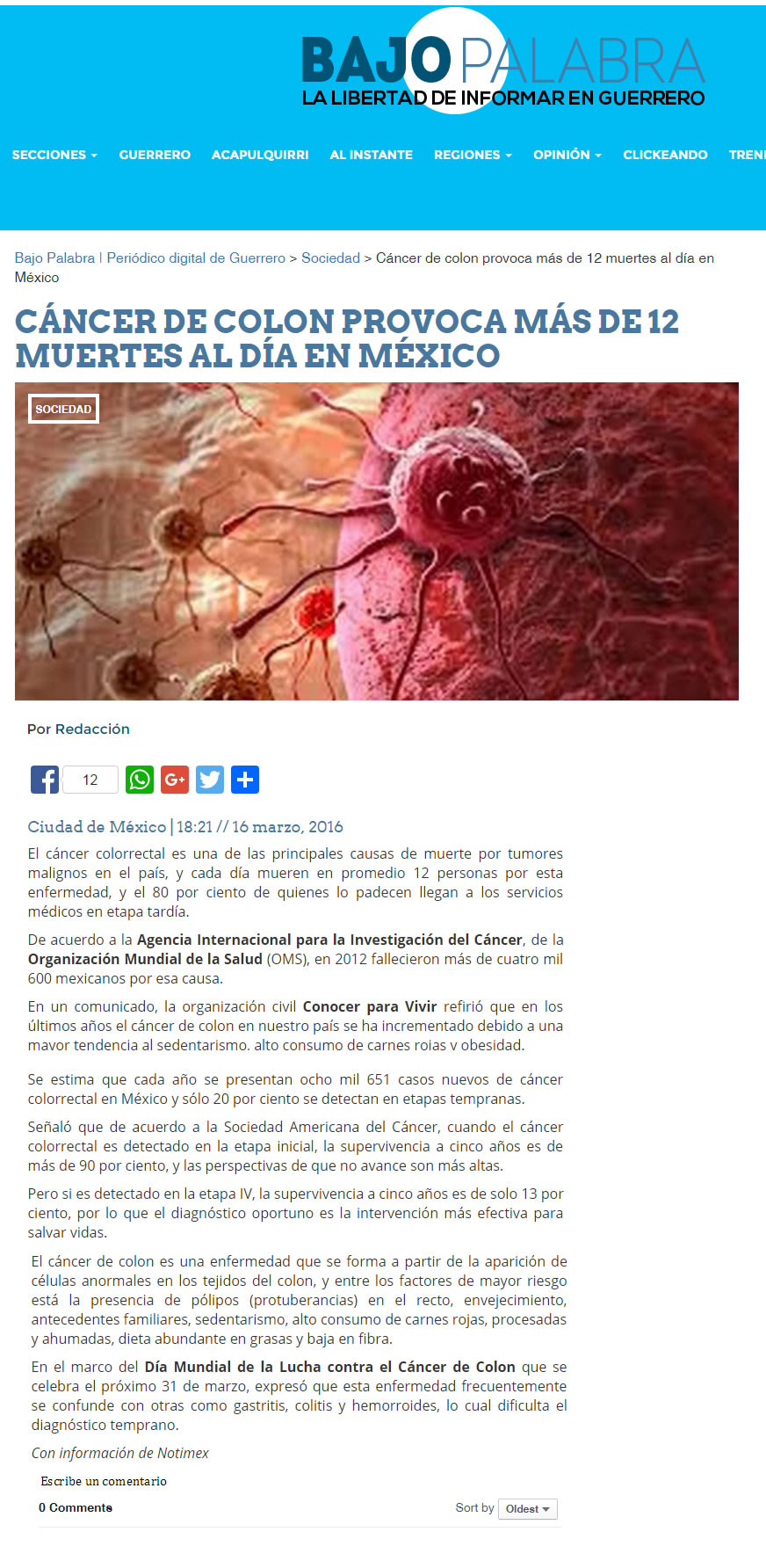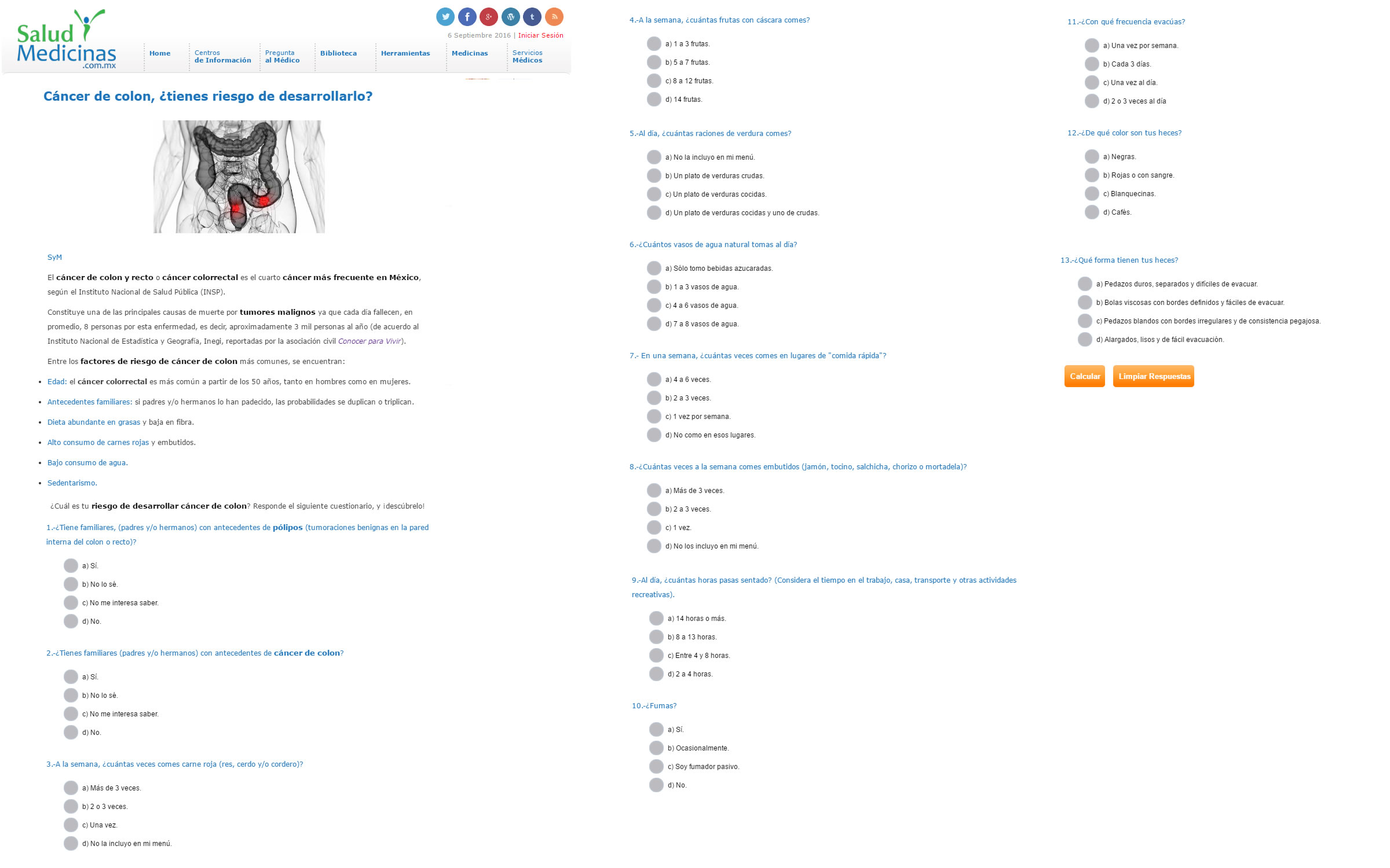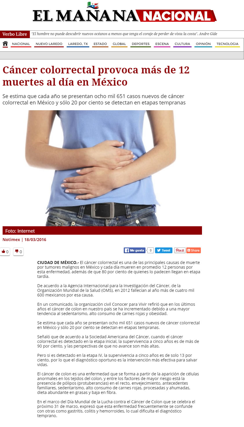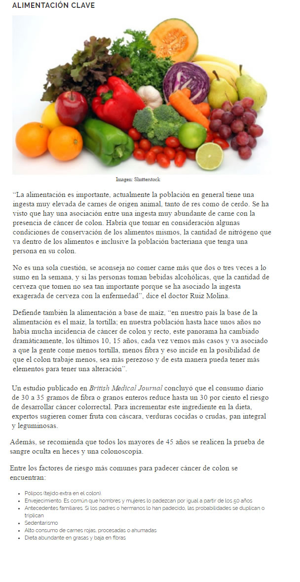 Hasta 47% de los casos pueden prevenirse con una alimentación saludable, la activación física y un peso equilibrado. La ingesta de fibra reduce el riesgo de padecer cáncer de colon. Ciudad de México a 28 de abril de 2016. - En México el cáncer colorrectal es un problema de salud grave que se ha incrementado en los últimos años debido al sedentarismo, obesidad y mala alimentación. Cada año se presentan poco más de 8 mil casos de este padecimiento y 4 mil fallecimientos. Un estudio publicado en British Medical Journal * indica que el consumo diario de 30 a 35 gramos de fibra o granos enteros reduce hasta un 30% riesgo de desarrollar cáncer colorrectal. ¿Por qué? Porque la fibra favorece evacuaciones frecuentes, abundantes y fáciles de expulsar reduciendo el riesgo de padecimientos como estreñimiento, hemorroides, diverticulosis y cáncer colorrectal. El problema es que los mexicanos ingerimos 15.8 gramos* de fibra al día, lo que representa la mitad del consumo recomendado. Por ello, especialistas de Conocer para Vivir indican que para ingerir los 35 gramos diarios de fibra es preciso comer: Dos piezas de fruta con cáscara Un plato de verduras cocidas Un plato de verduras crudas 100 gramos de pan integral Un plato de leguminosas Para estimular que las personas que presenten factores de riesgo acudan oportunamente una revisión médica, Conocer para Vivir, les da cinco herramientas para detectar este padecimiento: 1. Incrementar el consumo de fibra**. Esta sustancia pasa por el sistema digestivo sin ser absorbida, es decir, no engorda. Además expulsa los compuestos dañinos fuera del cuerpo a través evacuaciones abundantes y frecuentes. 2. Realizar la Prueba de Sangre Oculta en Heces una vez al año. Es una prueba inicial que determinará si es necesario realizar una colonoscopia para detectar pólipos y cáncer de colon en etapas iniciales. 3. Vigilar cambios en los hábitos intestinales. Todos los días revisa la frecuencia, color y forma de las heces. En caso de presentar algún cambio, acude al especialista. 4. Acudir al gastroenterólogo una vez al año. Consulten con el especialista los síntomas de cualquier enfermedad gastrointestinal o directamente a un oncólogo, por pequeños o insignificantes que parezcan. Los síntomas de alarma son: Cambios en los hábitos intestinales (periodos de diarrea frecuentes y estreñimientos) Dolor abdominal o pélvico constantes Adelgazamiento u oscurecimiento de las heces fecales Sensación persistente de defecar (tenesmo) aún después de ir al baño Sangrado evidente en las heces Calambres y vómitos constantes Pérdida de peso inexplicable 5. Responder el test “¿Cuál es tu riesgo de desarrollar cáncer de colon?”. Es un cuestionario sencillo para valorar la salud del colon y tomar consciencia sobre nuestra alimentación y hábitos intestinales. Te enviamos este test que permite medir el riesgo de cáncer de colon. Hasta un 47% de los casos de cáncer colorrectal pueden prevenirse mediante una alimentación saludable, la activación física y el mantenimiento de un peso equilibrado (Fondo Mundial para la Investigación contra el Cáncer). ¡La detección oportuna salva vidas! Referencias: * Dietary fibre, whole grains, and risk of colorectal cancer: systematic review and dose-response meta-analysis of prospective studies, 2011. Notas (La Crónica / Salud y Medicinas / sin embargo.mx) ¿Cuál es tu riesgo de desarrollar cáncer de colon? ¡Responde el test y averígualo! (Aquí van las imágenes del test y un link donde pueden consultarlo) También puedes responder este sencillo cuestionario en el siguiente link: http://bit.ly/23ZGvpz Agradecemos al portal Salud y Medicinas por permitirnos llegar a más personas a través de esta publicación. Descargar Test: Cuál es tu riesgo de desarrollar cáncer de colon |