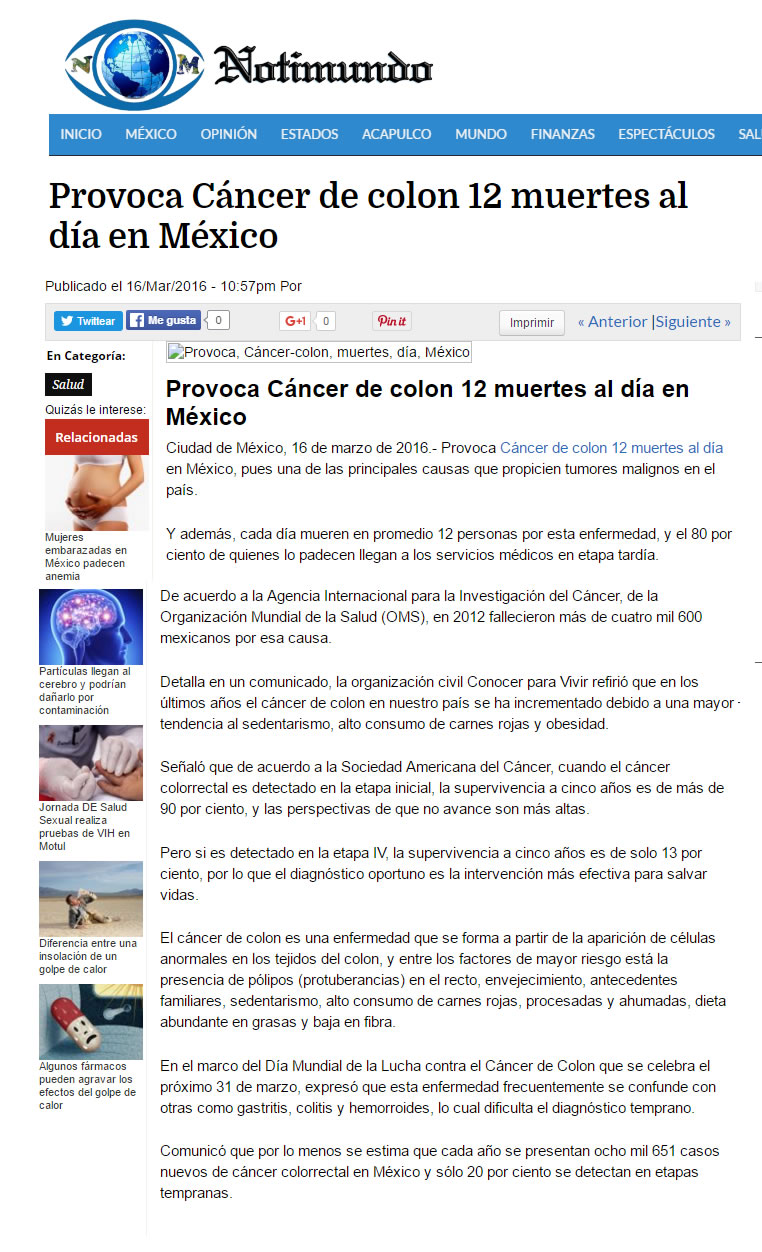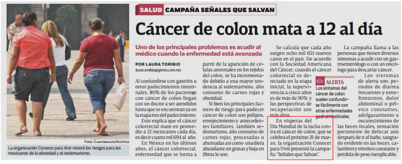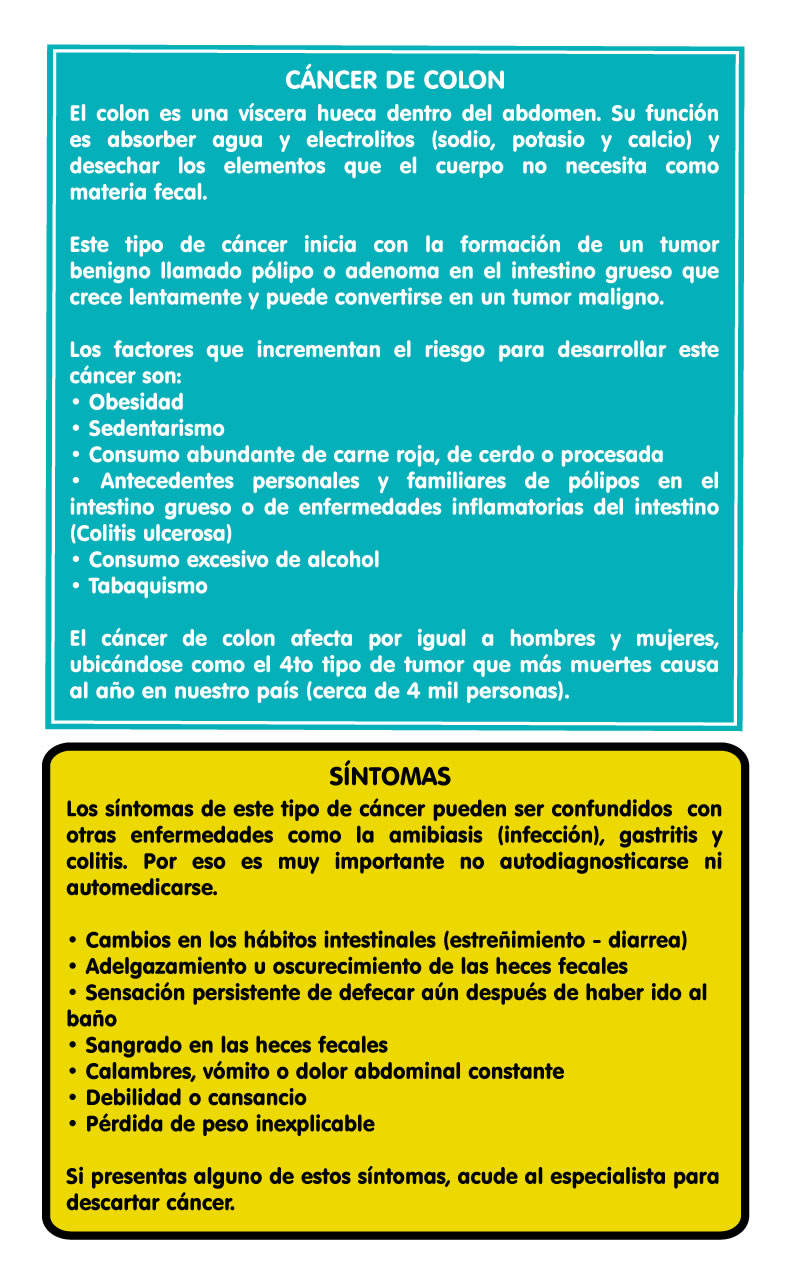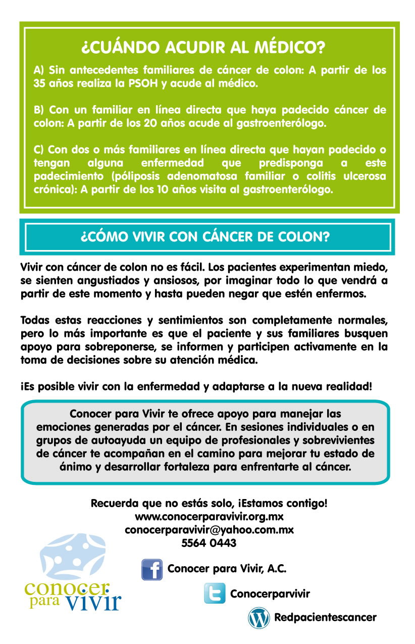 Entre los factores de riesgo más comunes para padecer cáncer de colon se encuentran (en orden de importancia): Pólipos (ya sea por Poliposis común o PoliposisAdenomatosa Hereditaria). Envejecimiento. Es común que hombres y mujeres lo padezcan por igual a partir de los 50 años Antecedentes familiares. Si los padres o hermanos lo han padecido, las probabilidades se duplican o triplican Sedentarismo Alto consumo de carnes rojas, procesadas o ahumadas Dieta abundante en grasas y baja en fibras Alto al Cáncer de Colon El mayor problema para lograr diagnósticos oportunos es que los síntomas del cáncer de colon suelen confundirse fácilmente con otras enfermedades gastrointestinales como gastritis, colitis, amibiasis o hemorroides, pues al igual que en estos padecimientos, el paciente presenta dolor abdominal o pélvico, diarrea, disminución en el tamaño de las heces fecales y presencia de anemia, cansancio y debilidad. Para conmemorar el Día Mundial de la Lucha contra el Cáncer de Colon que se celebra el próximo 31 de Marzo y con la finalidad de detectar a tiempo la enfermedad, Conocer para Vivir presenta la campaña “ Señales que Salvan”. “¿Sabían que el tratamiento para un solo paciente en etapa III tiene un costo estimado de 700 mil pesos y su pronóstico de supervivencia a 5 años es del 13%? Sabemos de muchos casos en los que la gente se acostumbra a vivir con el dolor o se automedica. Hoy les pedimos que atiendan los síntomas de cualquier enfermedad gastrointestinal, por pequeños o insignificantes que parezcan”, comenta Carolina Eslava, presidenta de Conocer para Vivir. Si una persona presenta alguno de los siguientes síntomas a pesar de recibir un tratamiento médico, es muy importante que acuda con un gastroenterólogo o con un oncólogo para descartar cáncer: Cambios en los hábitos intestinales (periodos de diarrea frecuentes y estreñimientos) Dolor abdominal o pélvico constantes Adelgazamiento u oscurecimiento de las heces fecales Sensación persistente de defecar (tenesmo) aún después de ir al baño Sangrado evidente en las heces Calambres y vómitos constante Pérdida de peso inexplicable Además, los médicos especialistas de Conocer para Vivir recomiendan realizarse una Prueba de Sangre Oculta en Heces cada 12 meses a partir de los 35 años de edad en hombres y mujeres . Esta prueba inicial determinará si es necesario realizar una colonoscopía para detectar pólipos y cáncer de colon en etapas iniciales. Hoy y todos los días revisa tus hábitos de evacuación, el color de tus heces y cuida tu alimentación. |