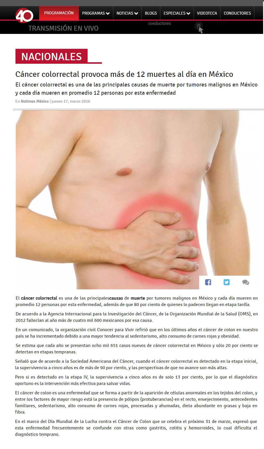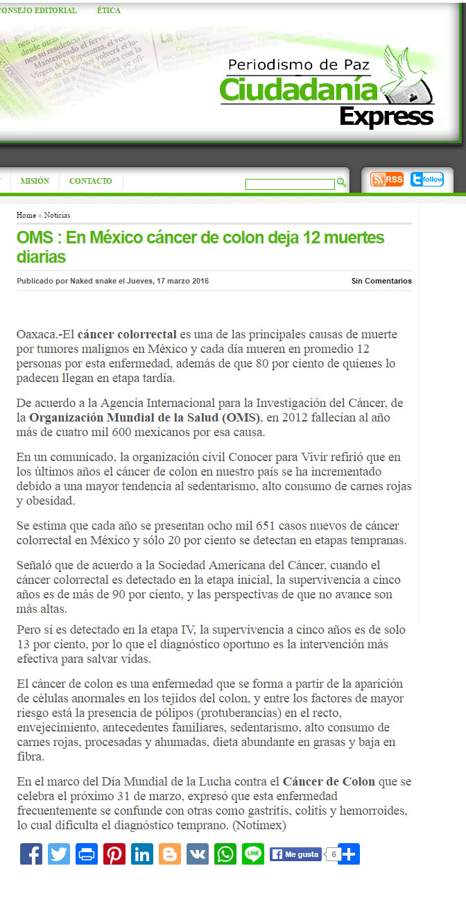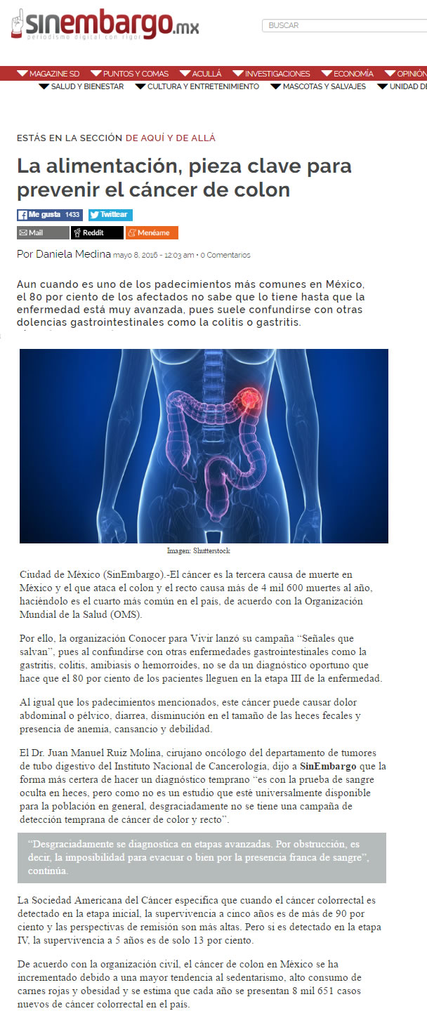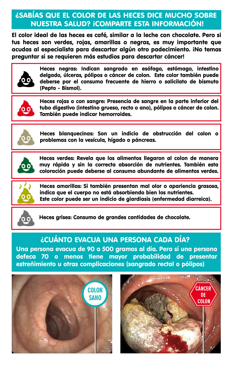 Entre los factores de riesgo más comunes para padecer cáncer de colon se encuentran (en orden de importancia): Pólipos (ya sea por Poliposis común o PoliposisAdenomatosa Hereditaria). Envejecimiento. Es común que hombres y mujeres lo padezcan por igual a partir de los 50 años Antecedentes familiares. Si los padres o hermanos lo han padecido, las probabilidades se duplican o triplican Sedentarismo Alto consumo de carnes rojas, procesadas o ahumadas Dieta abundante en grasas y baja en fibras Alto al Cáncer de Colon El mayor problema para lograr diagnósticos oportunos es que los síntomas del cáncer de colon suelen confundirse fácilmente con otras enfermedades gastrointestinales como gastritis, colitis, amibiasis o hemorroides, pues al igual que en estos padecimientos, el paciente presenta dolor abdominal o pélvico, diarrea, disminución en el tamaño de las heces fecales y presencia de anemia, cansancio y debilidad. Para conmemorar el Día Mundial de la Lucha contra el Cáncer de Colon que se celebra el próximo 31 de Marzo y con la finalidad de detectar a tiempo la enfermedad, Conocer para Vivir presenta la campaña “ Señales que Salvan”. “¿Sabían que el tratamiento para un solo paciente en etapa III tiene un costo estimado de 700 mil pesos y su pronóstico de supervivencia a 5 años es del 13%? Sabemos de muchos casos en los que la gente se acostumbra a vivir con el dolor o se automedica. Hoy les pedimos que atiendan los síntomas de cualquier enfermedad gastrointestinal, por pequeños o insignificantes que parezcan”, comenta Carolina Eslava, presidenta de Conocer para Vivir. Si una persona presenta alguno de los siguientes síntomas a pesar de recibir un tratamiento médico, es muy importante que acuda con un gastroenterólogo o con un oncólogo para descartar cáncer: Cambios en los hábitos intestinales (periodos de diarrea frecuentes y estreñimientos) Dolor abdominal o pélvico constantes Adelgazamiento u oscurecimiento de las heces fecales Sensación persistente de defecar (tenesmo) aún después de ir al baño Sangrado evidente en las heces Calambres y vómitos constante Pérdida de peso inexplicable Además, los médicos especialistas de Conocer para Vivir recomiendan realizarse una Prueba de Sangre Oculta en Heces cada 12 meses a partir de los 35 años de edad en hombres y mujeres . Esta prueba inicial determinará si es necesario realizar una colonoscopía para detectar pólipos y cáncer de colon en etapas iniciales. Hoy y todos los días revisa tus hábitos de evacuación, el color de tus heces y cuida tu alimentación. |
